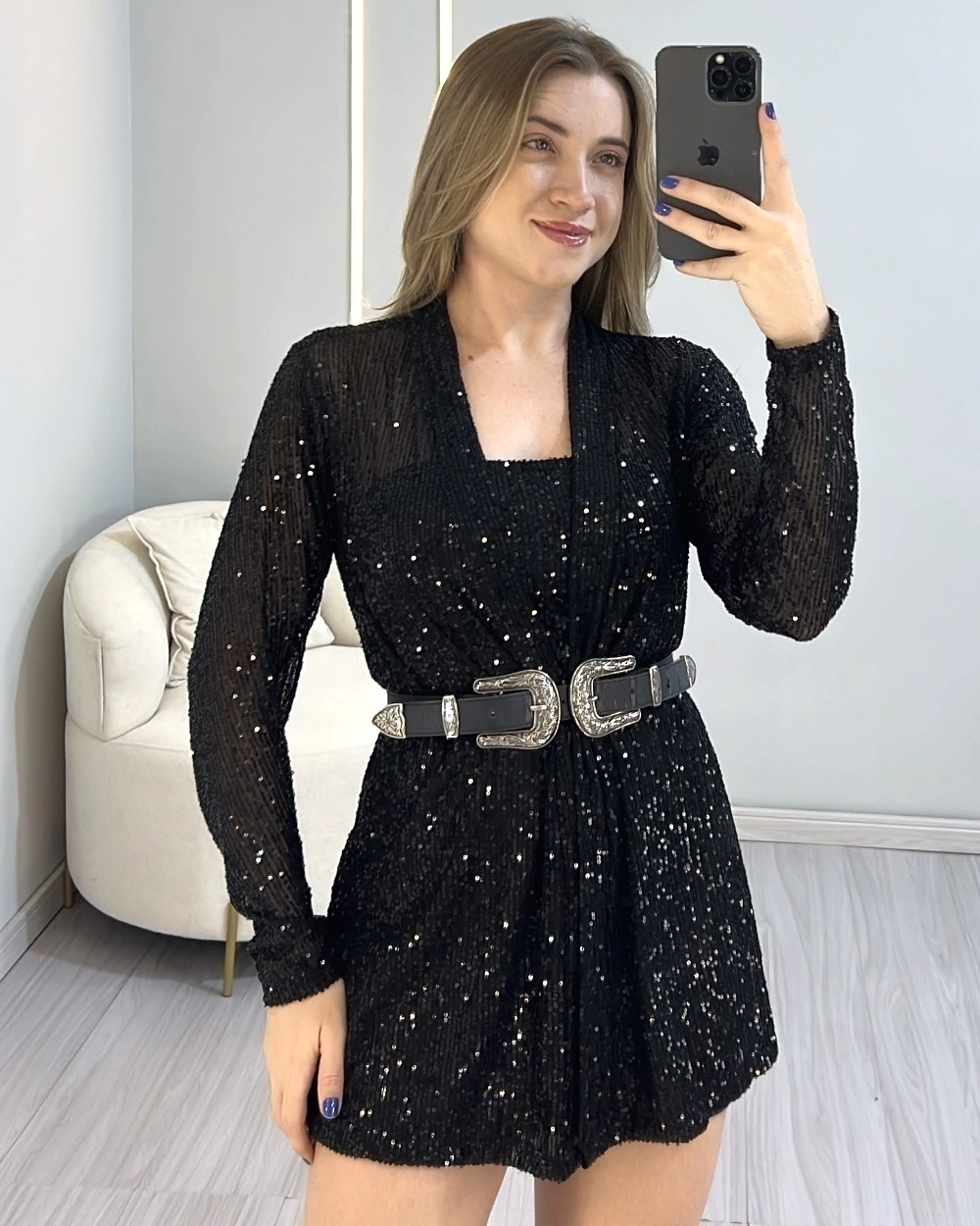 Cardigan confeccionado no paetê, comprimento alongado, mangas longas e sem fechamento.