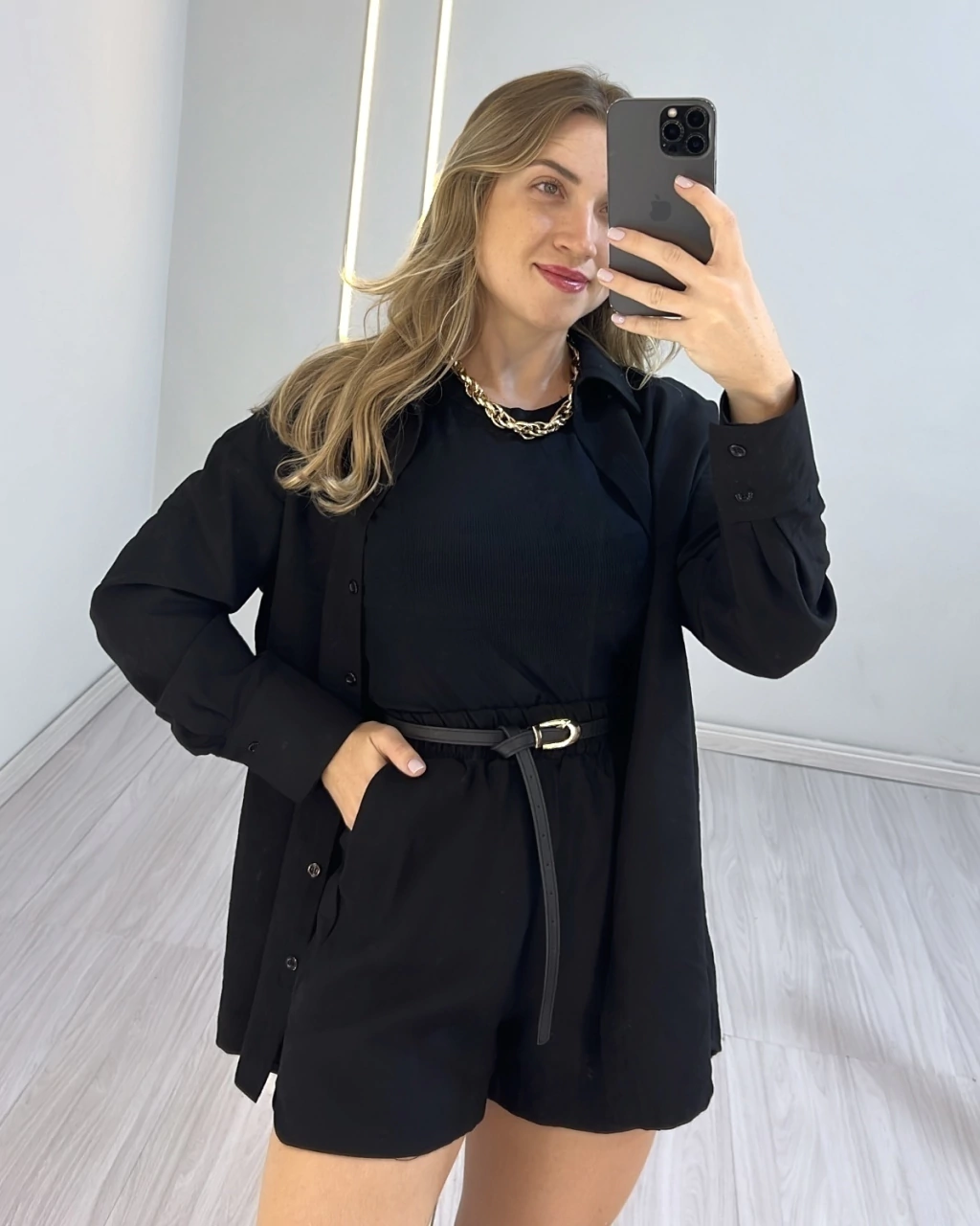 Conjunto confeccionado no tecido marant alfaiataria. Camisa alongada, fechamento em botões. O short possui cós alto, bolsos nas laterais e elastico na cintura.