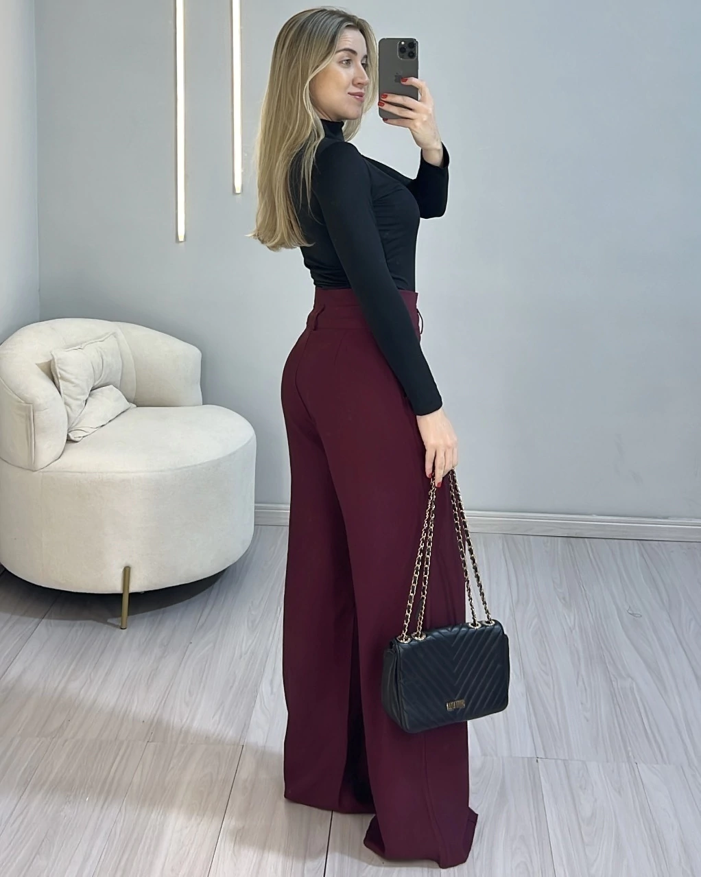 Calça pantalona confeccionado no tecido marant alfaiataria, cós alto, bolsos nas lasterais, fechamento com botão e zíper. Ideal para mulheres mais altas também por ser mais alongada.