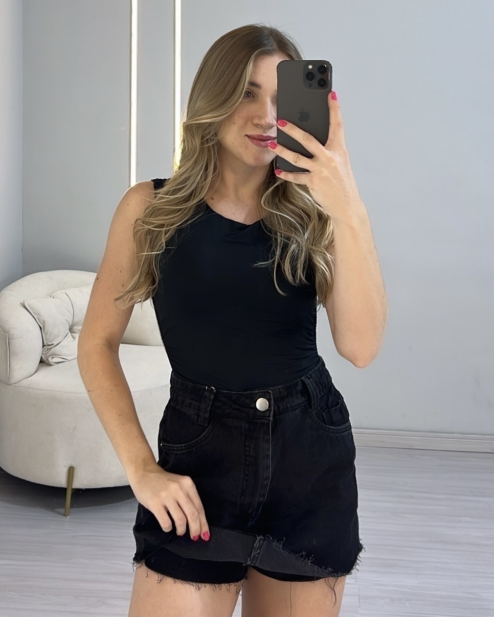 Short saia confeccioando no tecido jeans, cós alto, lavagem escura, barra desfiada, bolsos atrás e nas laterais, fechamento botão e zíper.