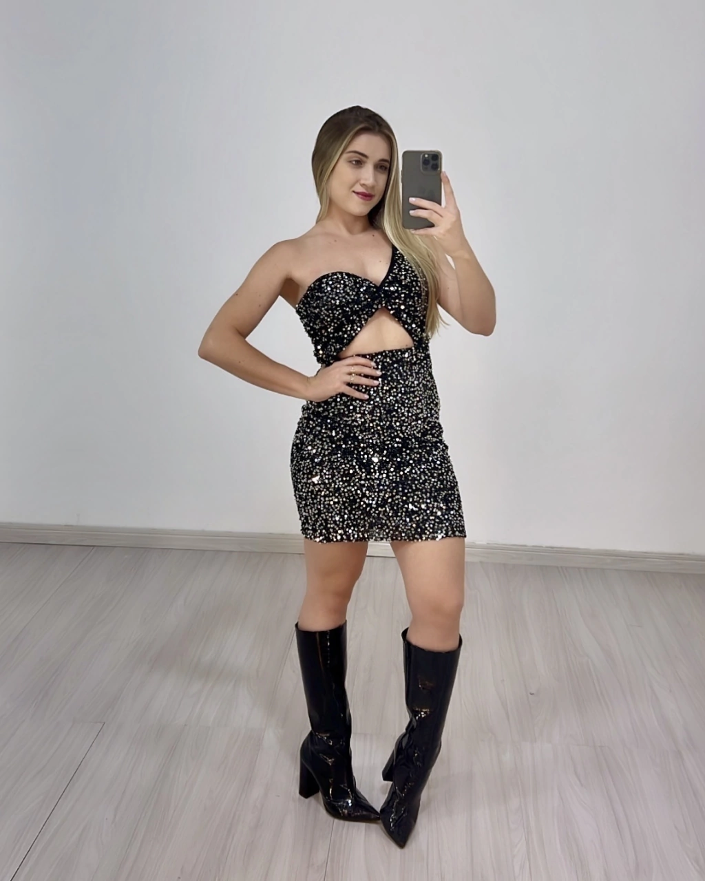 Vestido no tecido paetê. O modelo possui mula manca, com bojo, recorte na parte da frente e é todo forrado.Tamanho único – Veste 34 ao 40
